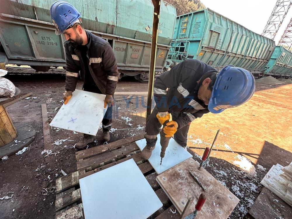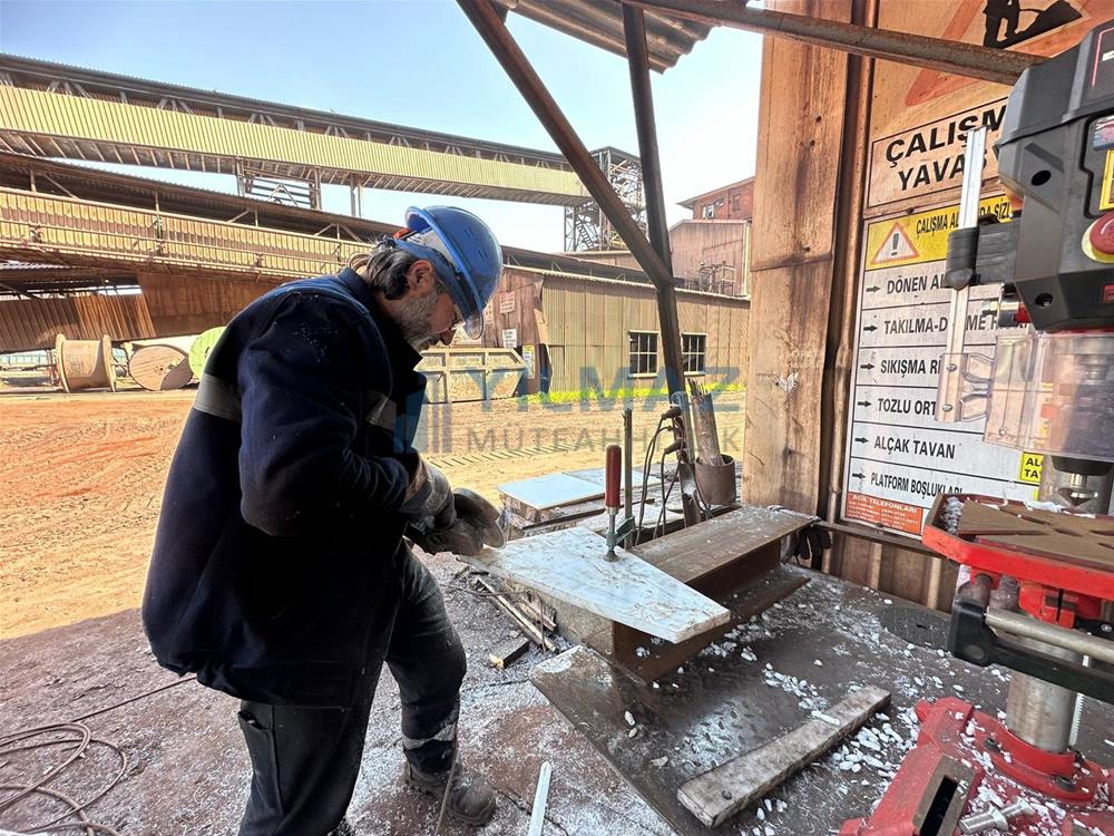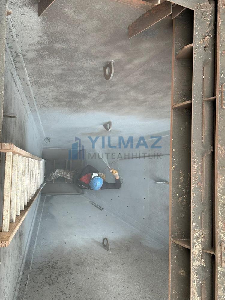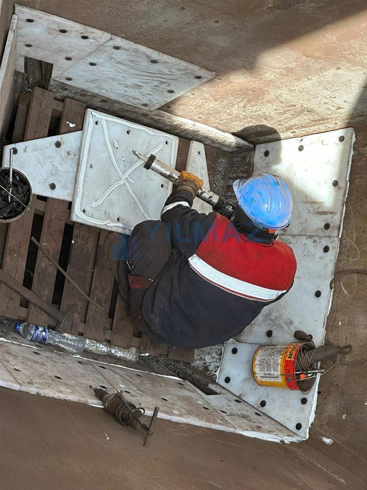 bunkerlerdeki mevcut kaplamaların demontaj işlemi, bunkerlerin kumlama ve astar işlemi, Almanya Simona firmasından Yılmaz Müteahhitlik firmasının temin etmiş olduğu PE1000 levhaların 500x500 ölçülerine göre kesilerek 8 yerinden paslanmaz havşa başlı civata ve fiber somun ile montajı ve sosis slikon uygulaması ile derz dolgu işlemlerini konu edinmekte olup, tamamı firmamız kapsamında yapılmıştır.